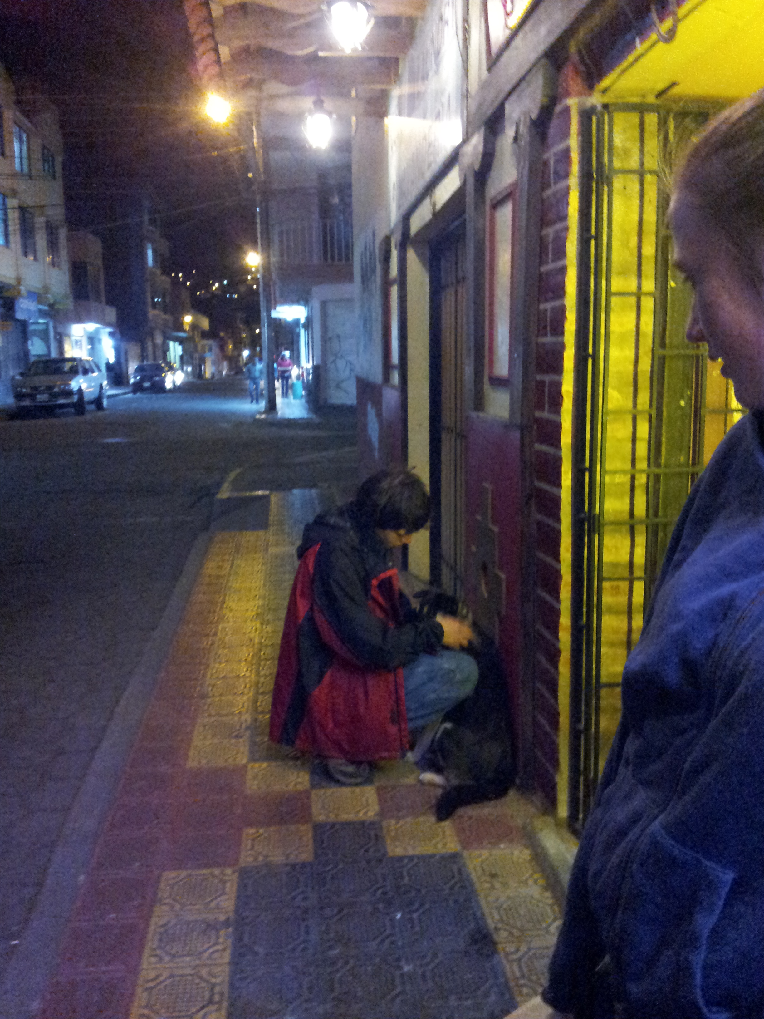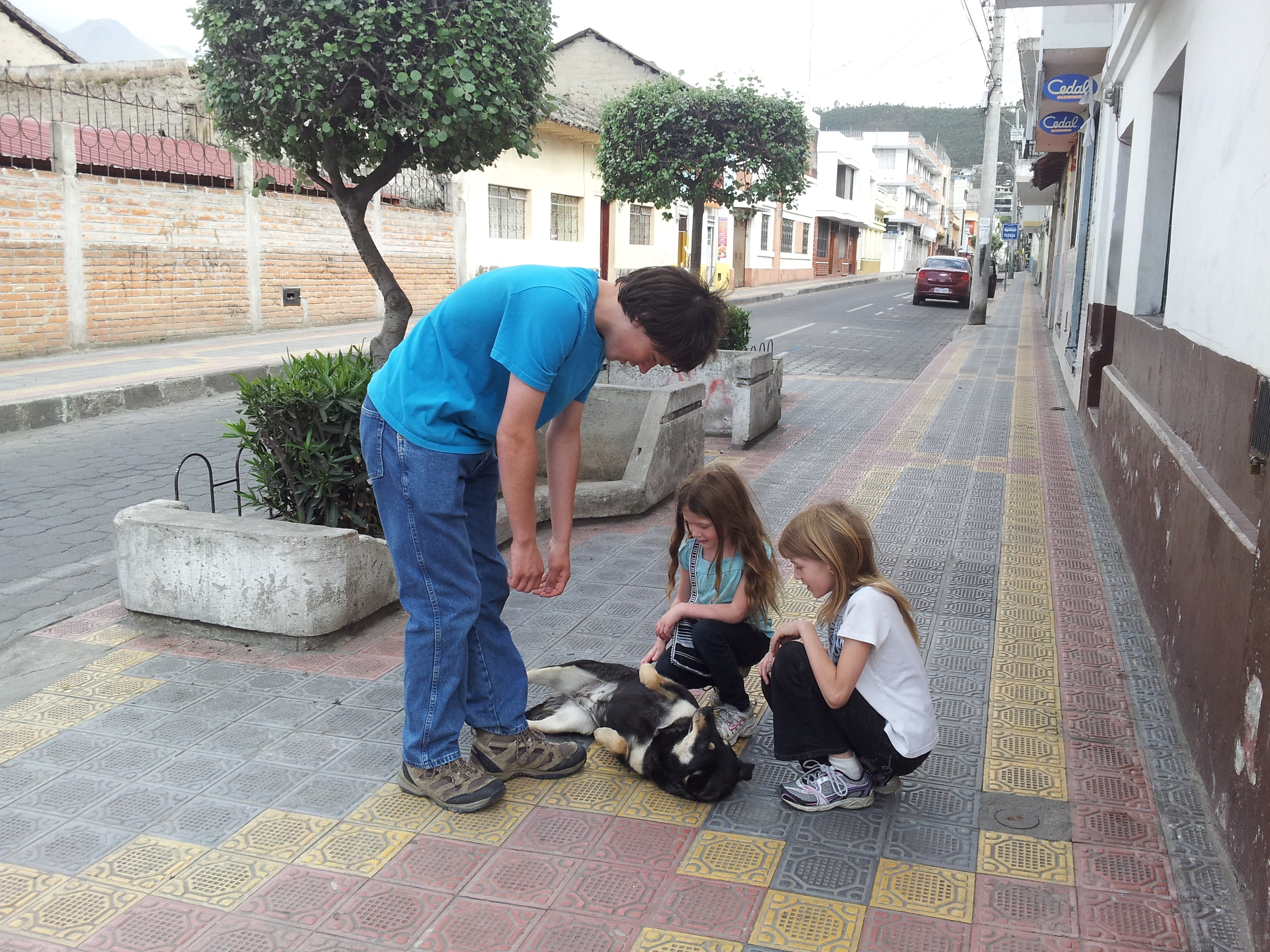 Louie got hit by a car here and his death was very hard on everyone. Two days later, a little dog showed up when we were in the market and followed Ryan all day. The dog continued to follow Ryan, sleeping in the road outside the parqueadero every night. We didn’t feed her or anything. She was particularly devoted to Ryan, waiting for him to come out of stores and waiting for him to wake up in the morning. She even tried to follow the van. She got shooed away from stores and restaurants and still persevered, we could not shake her. She is quiet and low key and seems happy to have kids who pet her.