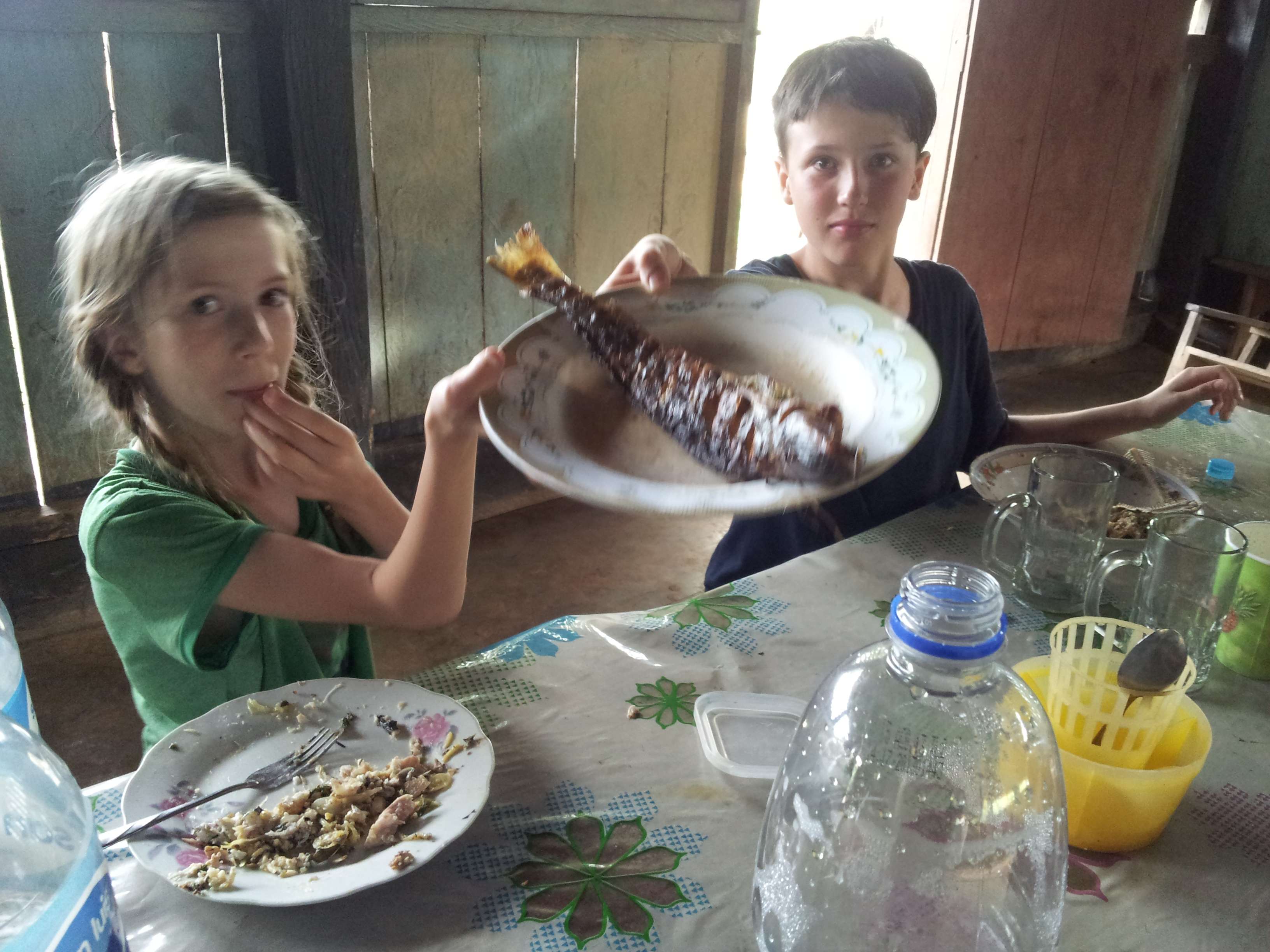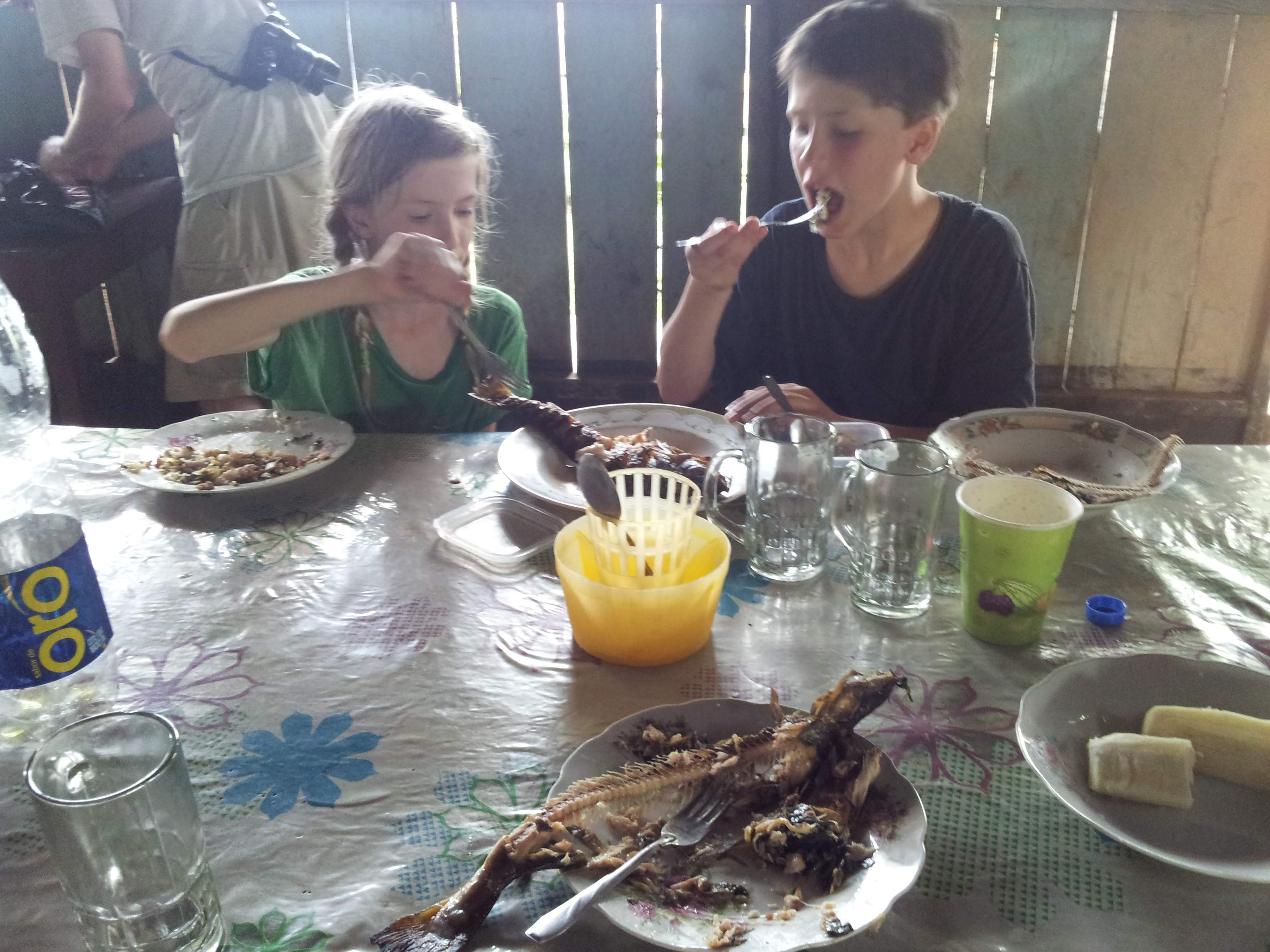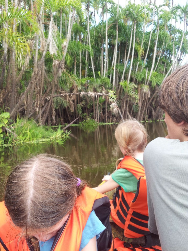 On the river, the kids had to wear the pfds. It doesn’t look scary here but it was absolutely scary in many places. No where to swim ashore, just marshy banks filled with poisonous snakes, fierce fish and caimans.