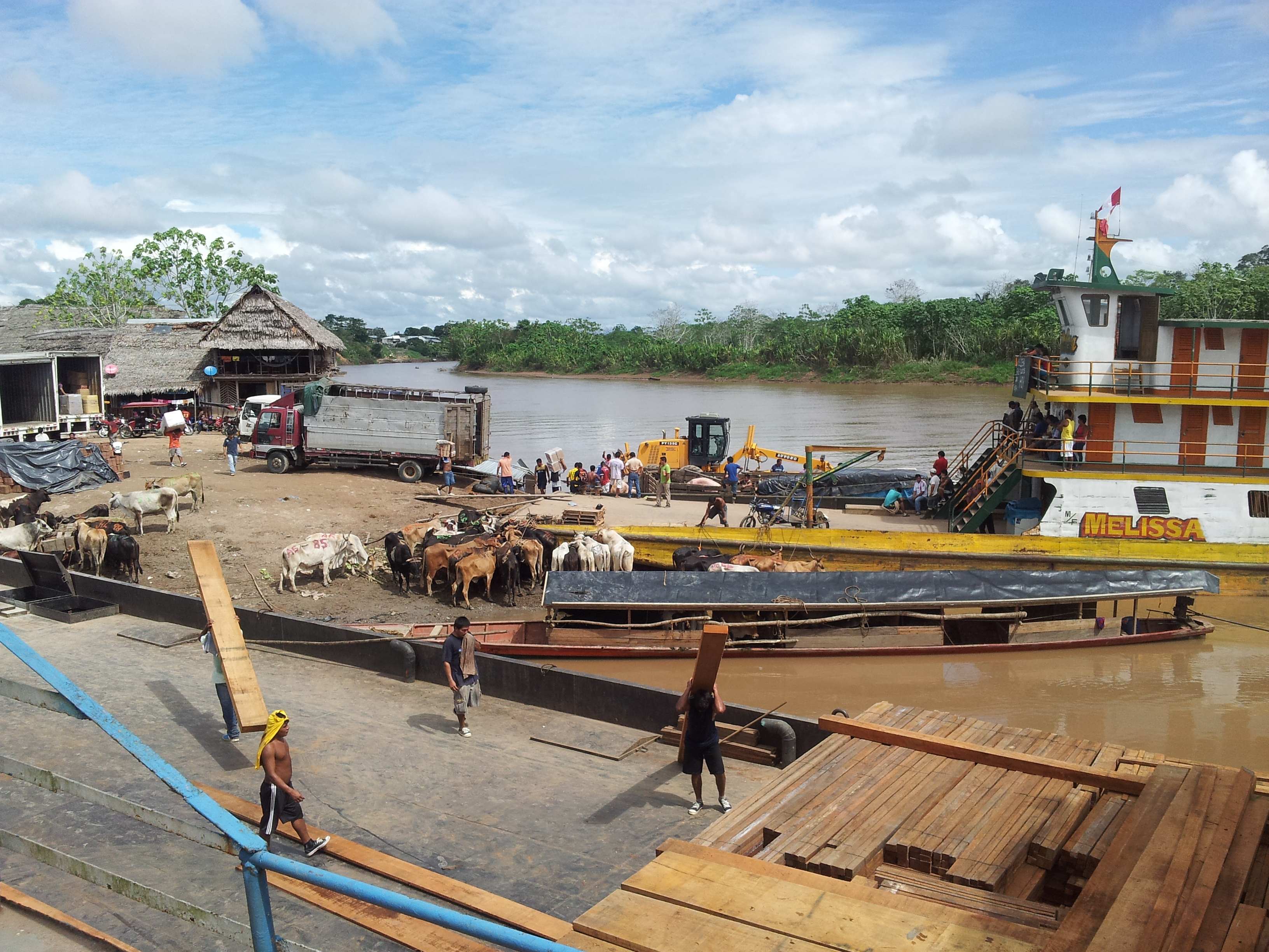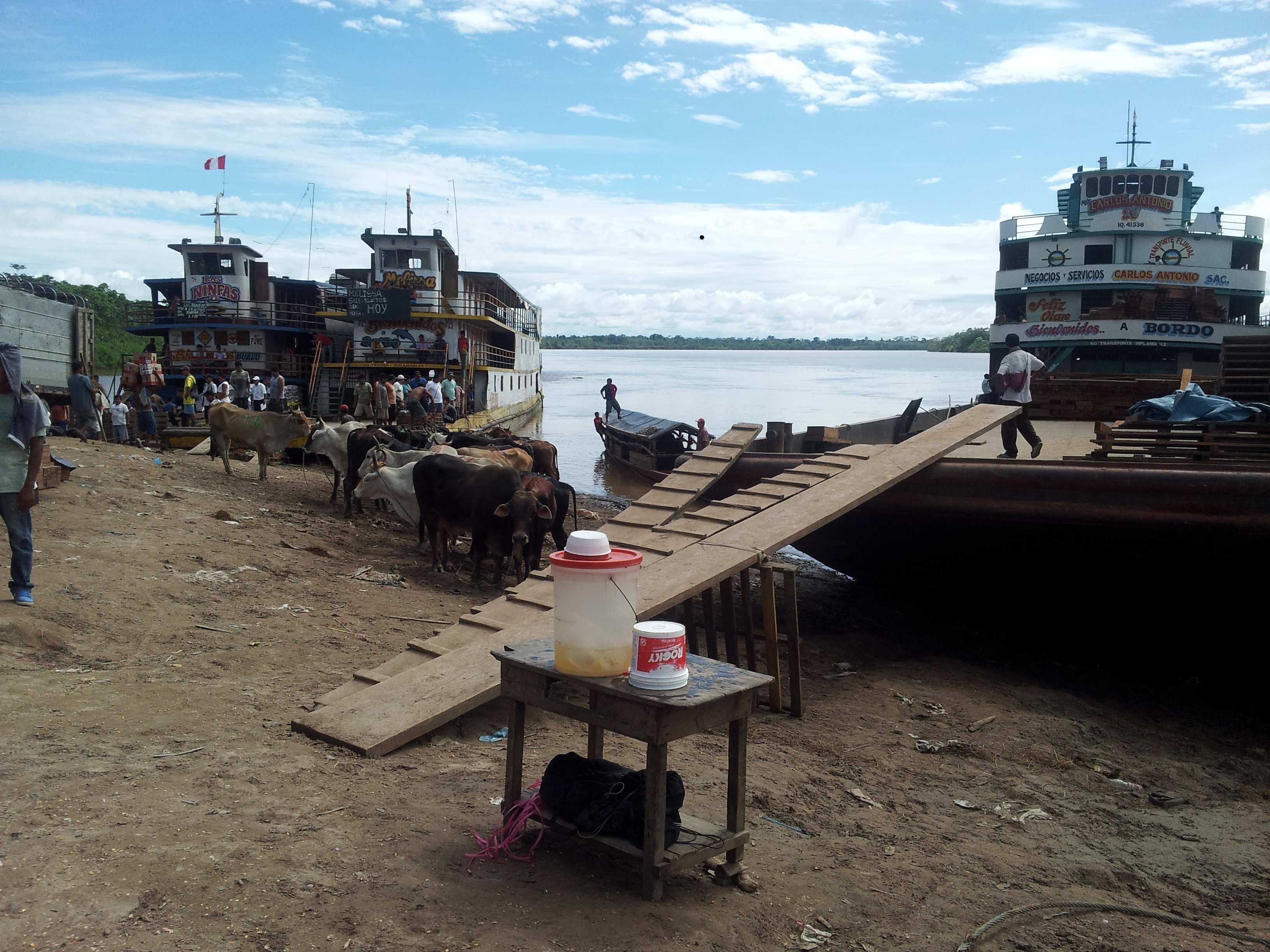 We arrived at about 6:30 and the Eduardo was still there – two guys with motos were waiting for us because, like all things in Peru, your word is as good as a contract and they knew we were coming. The two guys said we needed to get water and hammocks so they stopped at a shop and a pretty girl came out and sold us hammocks but she only had 5 so she had to call her sister to bring her more. We waited. The hammocks arrived. We stopped at a tiende and bought water and then we sped to the docks — only to see the Eduardo sailing away.