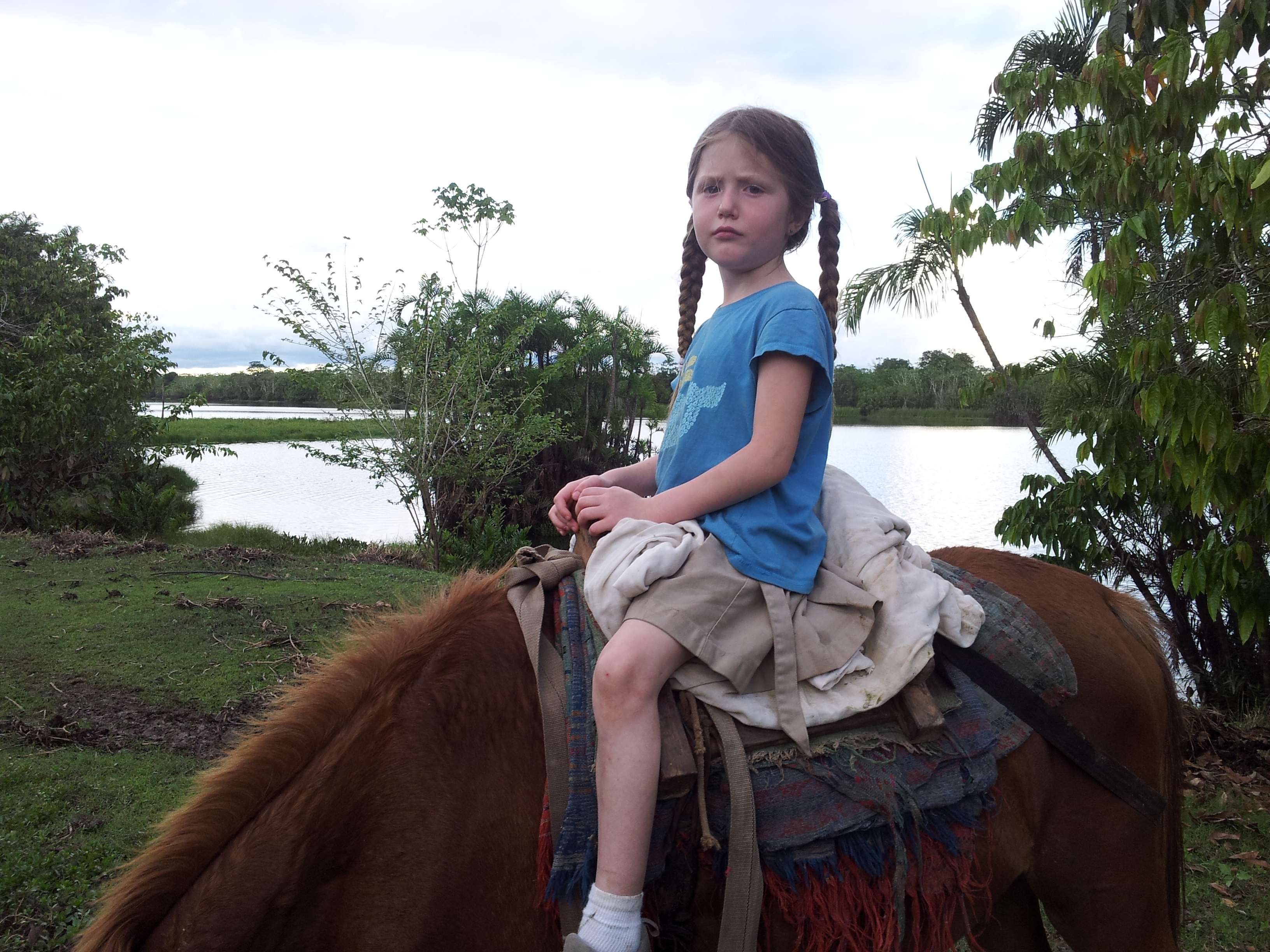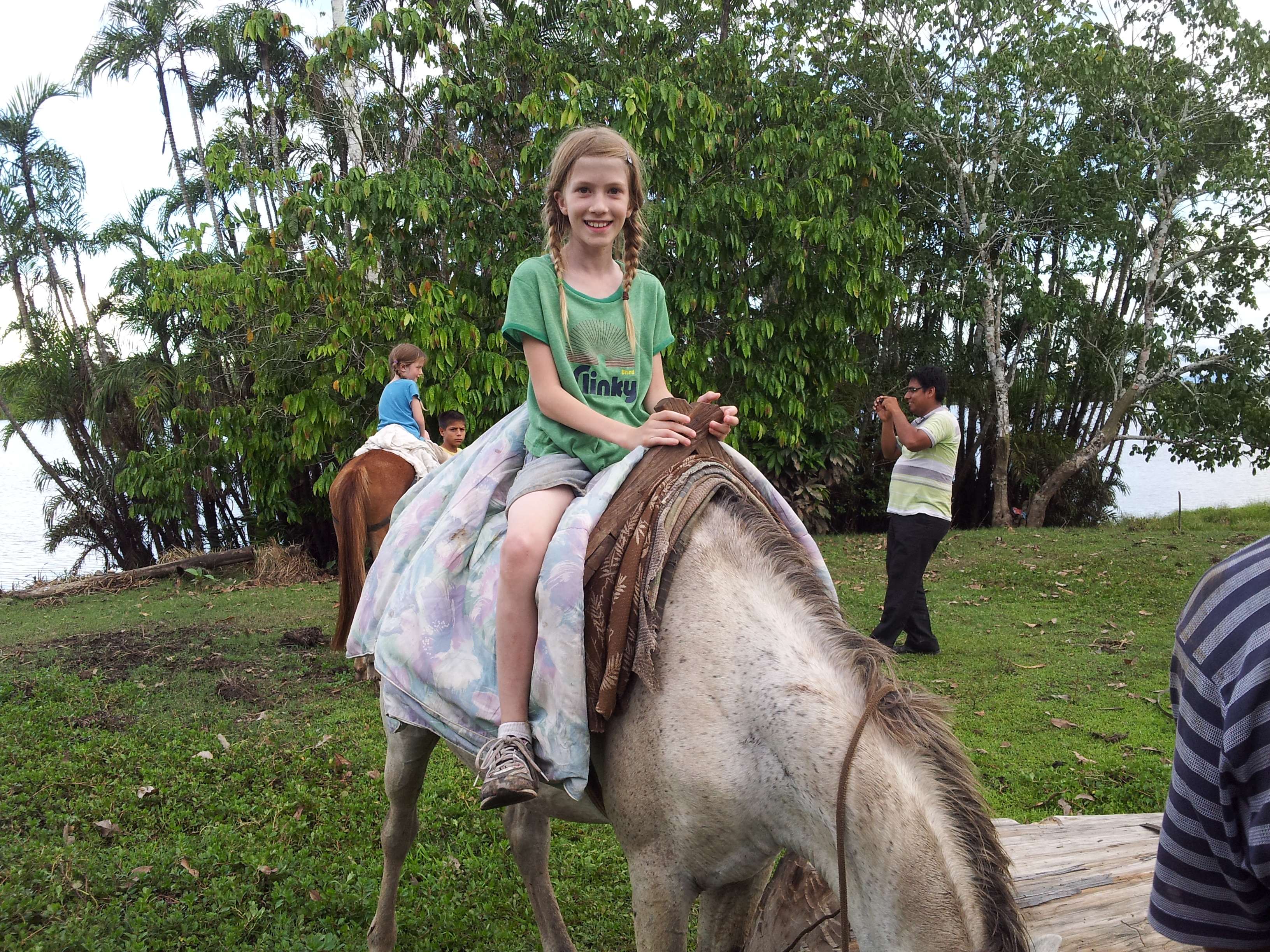 We went to dinner with Gabriel. A woman in the village had made us all dinner – fresh Amazon fish baked in leaves, yucca and plantain. The fish was served a la South America, with the head and all. 5 months ago this would have resulted in some sort of squeamishness from Team DeCorso but not anymore. The kids devoured the fish. Annie and Max ate 4 between them (one was Ryan’s). When we were all full, we headed over to Pepe’s for some horseback riding. They had two horses so Annie rode the entire time and sometimes Max or Sylvia rode a little on the other horse. Annie rode around the lake and through the selva and she had a great time. Pepe’s kids brought us all kinds of weird Amazon things to eat and we tried different fruits and vegetables and such. It was a great evening.