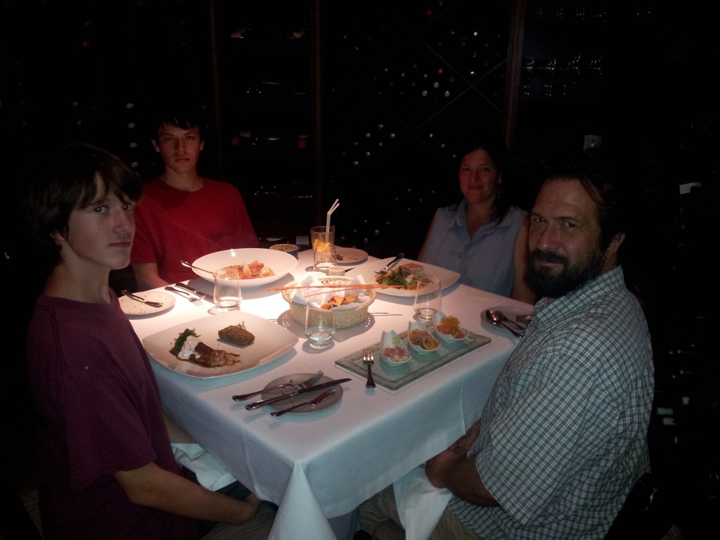 On Tuesday we made the painful journey again to a StarPeru office and bought our tickets (kids fly free!). We spent a lovely day hanging around Lima. Mark, Jack, Ryan and I went to eat at Astrid y Gaston, the 14th BEST restaurant in the world and, because it is in Peru, less expensive than the Vallata. #14 of the S.Pellegrino and Acqua Panna 50 Best Restaurants in the World! Mark had three traditional cebiches, I had fresh deep sea tuna with artichokes and sausage and creamy rice with green asparagus. Jack had Pink Lomitos yellowfin tuna, coconut foam, huacatay tamarind sauce and quinoa mai kai. Ryan had curry of the Andes, vegetable curry tubers and fruits of Peru with chaufa quinoa. The best part however was dessert – Jacks was “bananas trapped in a caramel cage with sweet bean paste and goat cheese ice cream”. Ryan had confite of maracuya & raspberry with carrot sponge cake served over top of sauteed bananas and raspberry foam with hand rolled divinity sticks. I had the Sensitive Sphere: raspberry sorbet contained within a chocolate shell with frozen creme brulee drenched in melted chocolate (which they let you pour as much as you need). Was it good? Not really. It was weird. And interesting. And so, so, fancy!