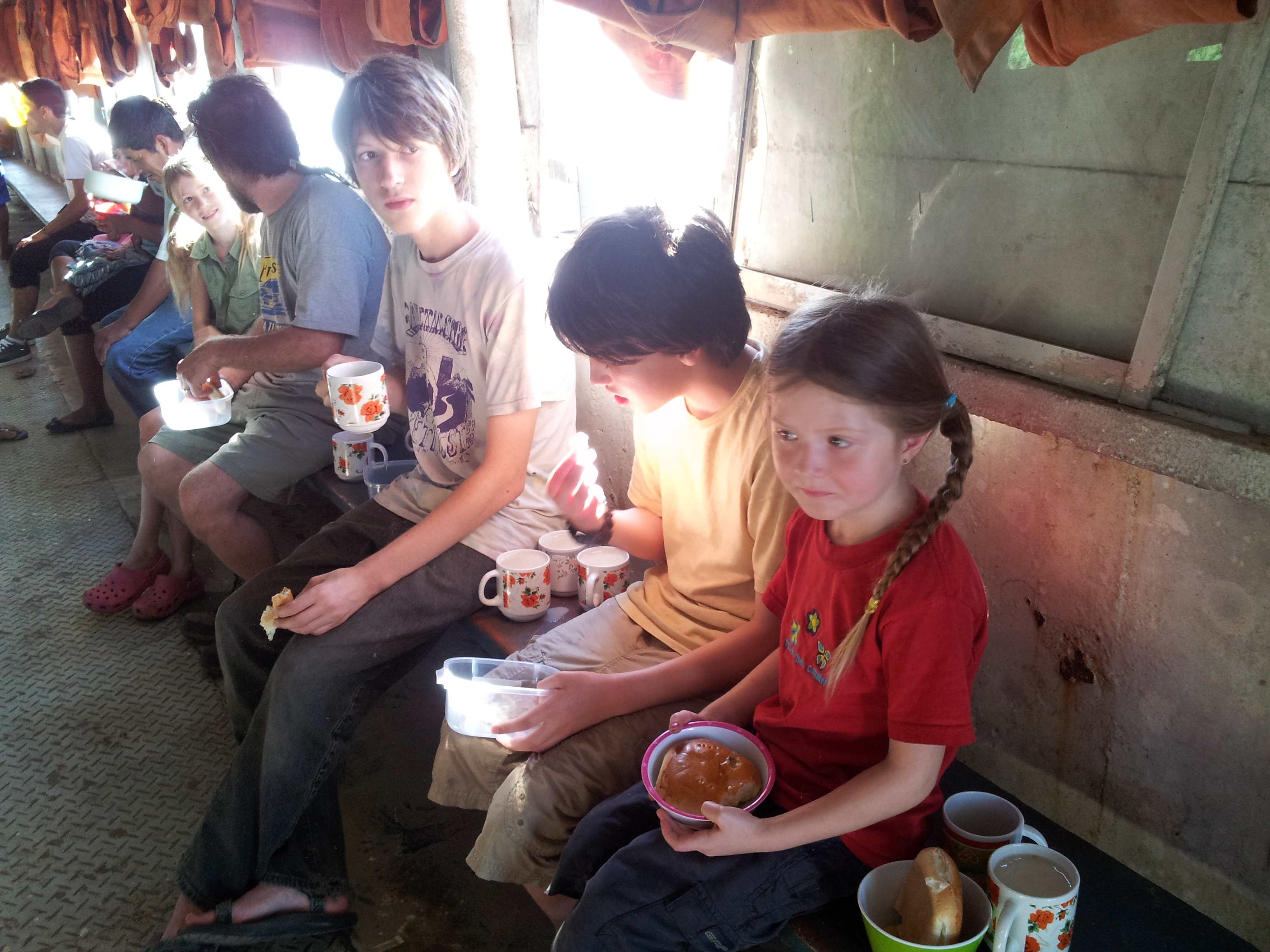 We were all hungry as watery banana porridge is not very filling so I sent Jack and Max to the cabin to bring down one duffle bag that had cookies and snacks in it and THAT tipped the scale. Suddenly we were surrounded by passengers – were we leaving? We were LEAVING? The Captain is a bad man, no? He makes the little children work instead of paying men. The Captain is not to be trusted. The Captain is a greedy man, selling space on the boat when he knows there is no food. What can we do?