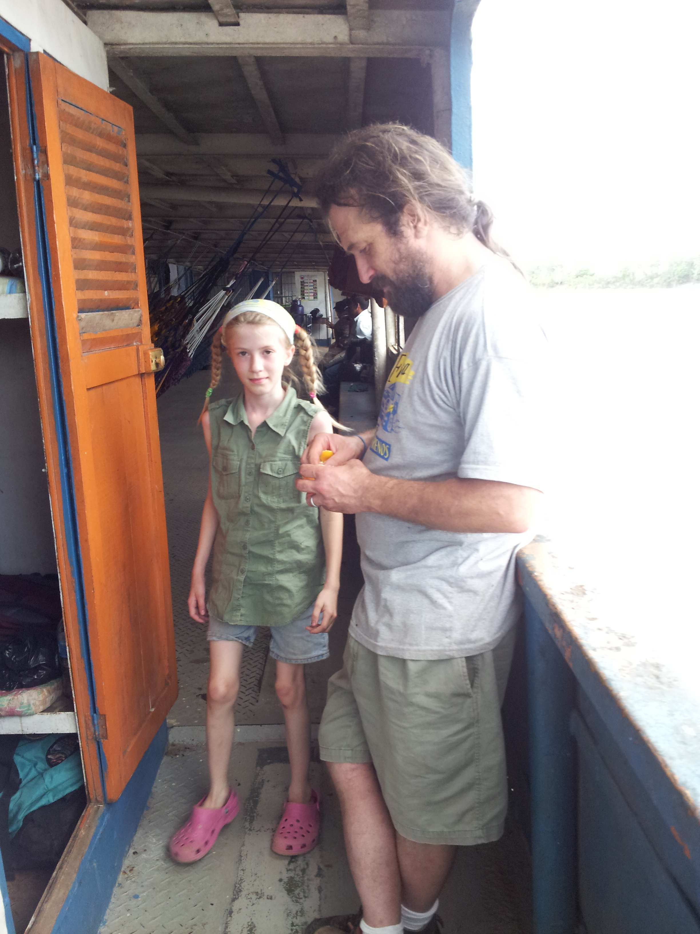 The boat had unisex bathrooms at the stern with 8 toilet stalls that also were showers. You could look out at the river and watch the dolphins. The bathroom was busy, the Haitian woman was always washing clothes, everyone showered every day and the men spent a lot of time styling their hair. The stalls were probably worse than you are imagining – no toilet seat, no light, a floor to ceiling door, all painted white but the paint was chipped and dirty and worn. The floor was always wet (from the shower). The stall was about 3 x 5 with a toilet in the middle. The shower was a pipe in the ceiling. You turned the handle and Amazon river water poured out. It was so hot when the boat was not moving, we all showered, even Sylvia.
