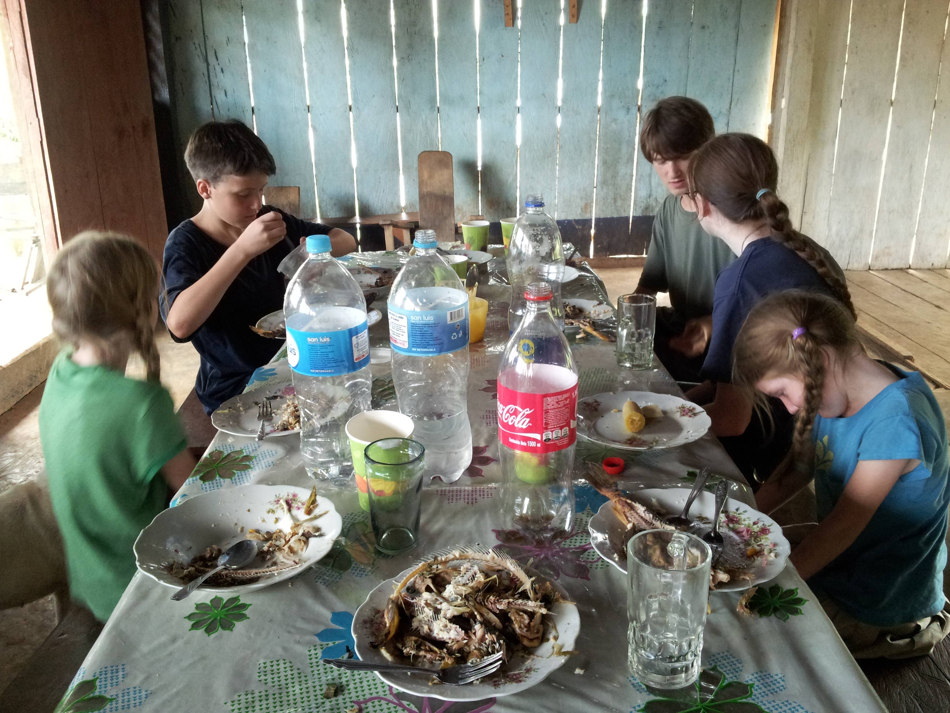 Mark, Ryan and Gabriel sat at the stern and looked for logs and such. We used an outboard motor on the bigger river and we hit logs so many times and each time the motor would stop and we would have to check the propeller. It was very exciting. We had to stop at a few homesteads and none had electricity, just candles burning in the window. We had visited a few jungle homes and they did not have walls which was unsettling to us considering all the bugs.