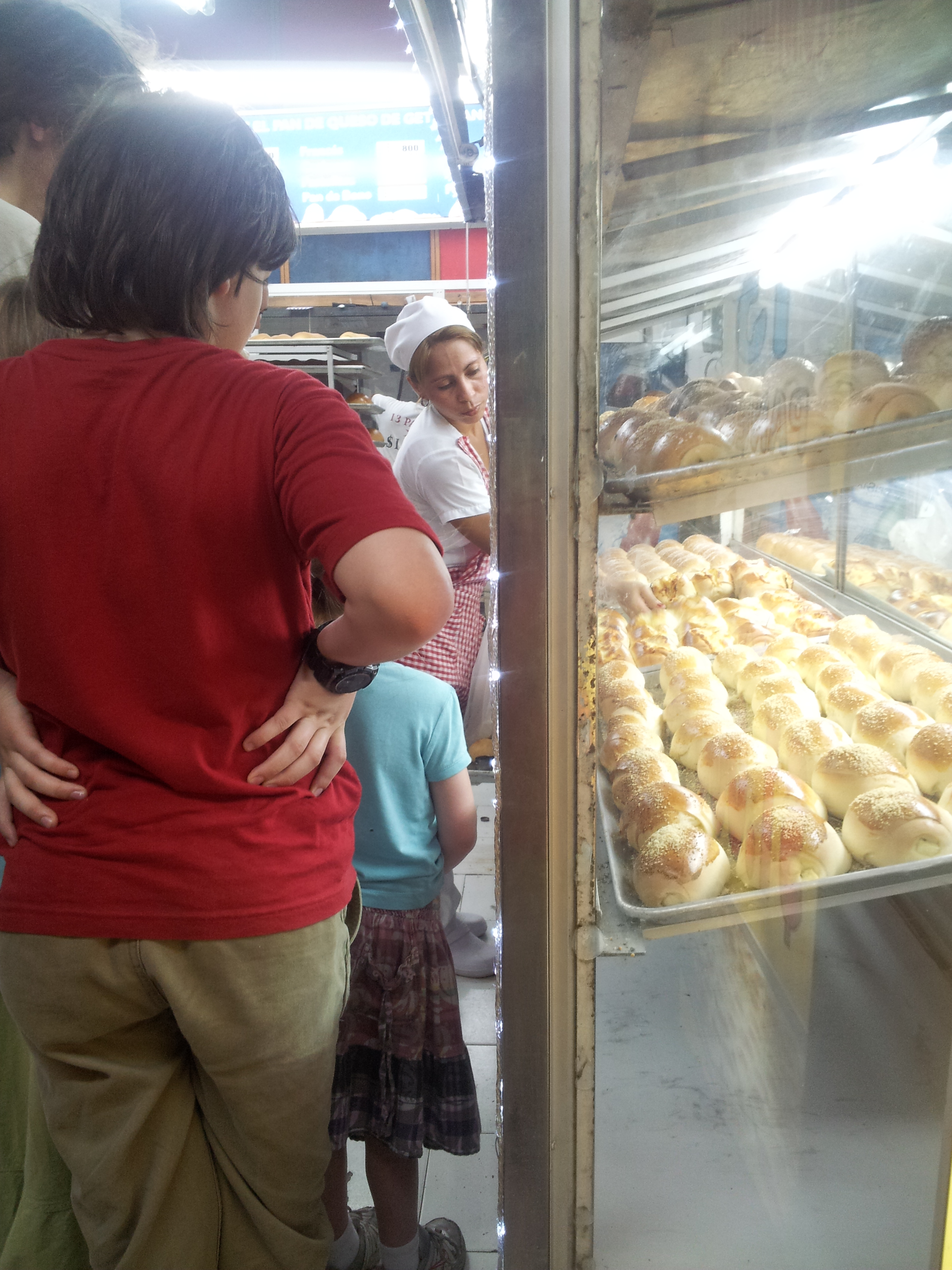 We have a little bakery very close to our hotel and they sell hot bread in the evening stuffed with cheese. We have been eating empanadas which are deep fried and have a thick slice of potato, an egg and cheese inside. They sell skewers of grilled steak on every corner and we had these sandwiches made of grilled potato pancakes, ground beef and cheese. We have eaten deep fried plantain and empanadas with spicy meat, too.