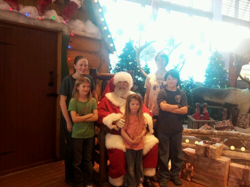 We stopped at the Bass Pro Shop to buy Mark shoes. We had never been to the Brass Pro Shop. Bekka & Jeremy told us it was fun but we had no idea what that meant. If you have never been to a Bass Pro Shop, it is like a Disneyland Fantasyland attraction for redneck type people. It was very neat! They have an underwater-bass-fishing-themed bowling alley / bar & grill where everything is blue and filled with fake logs and such. They have a huge three story waterfall with a glass fronted aquarium filled with bass. There is an old fashioned candy store and best of all, Santa!