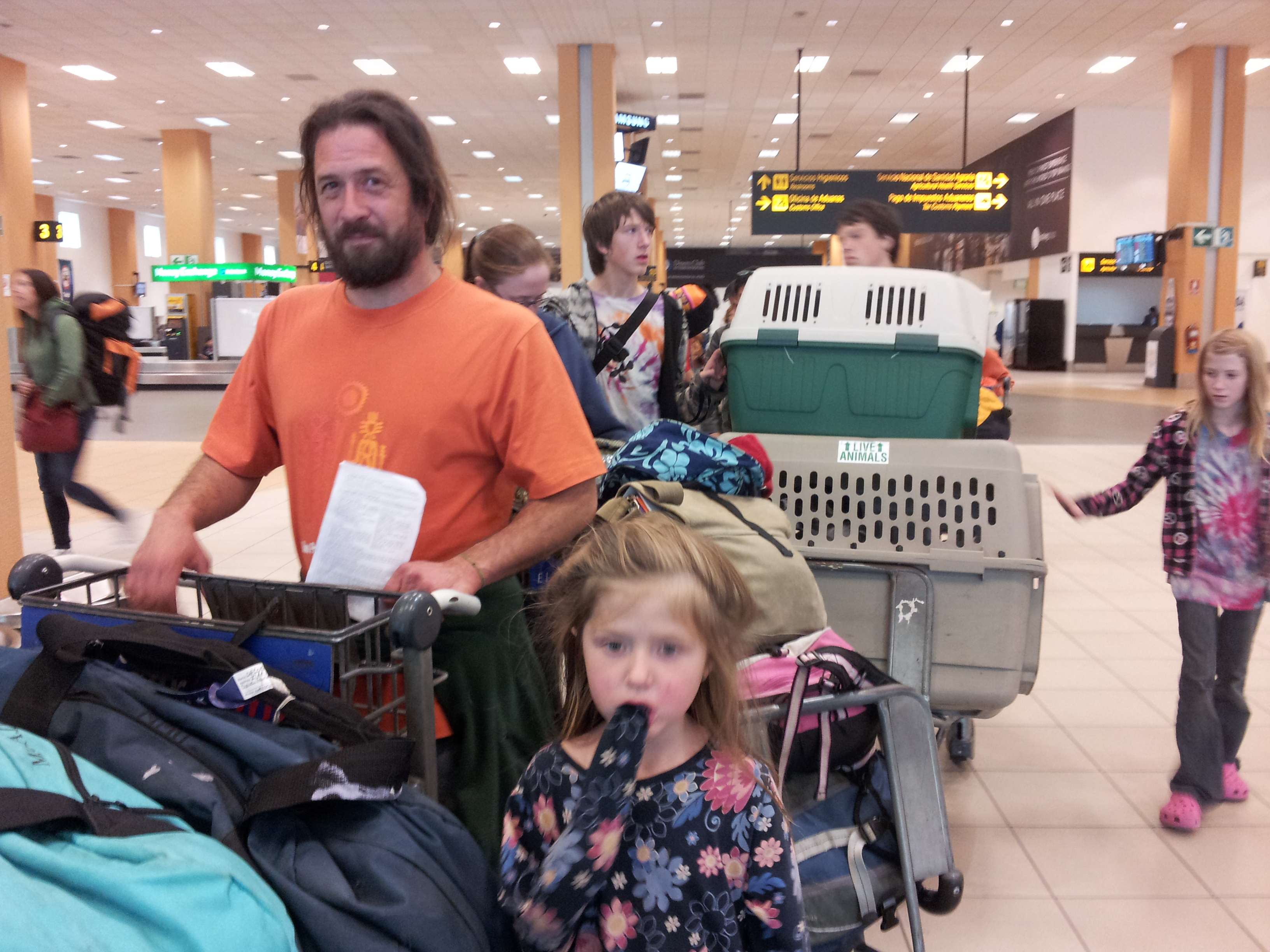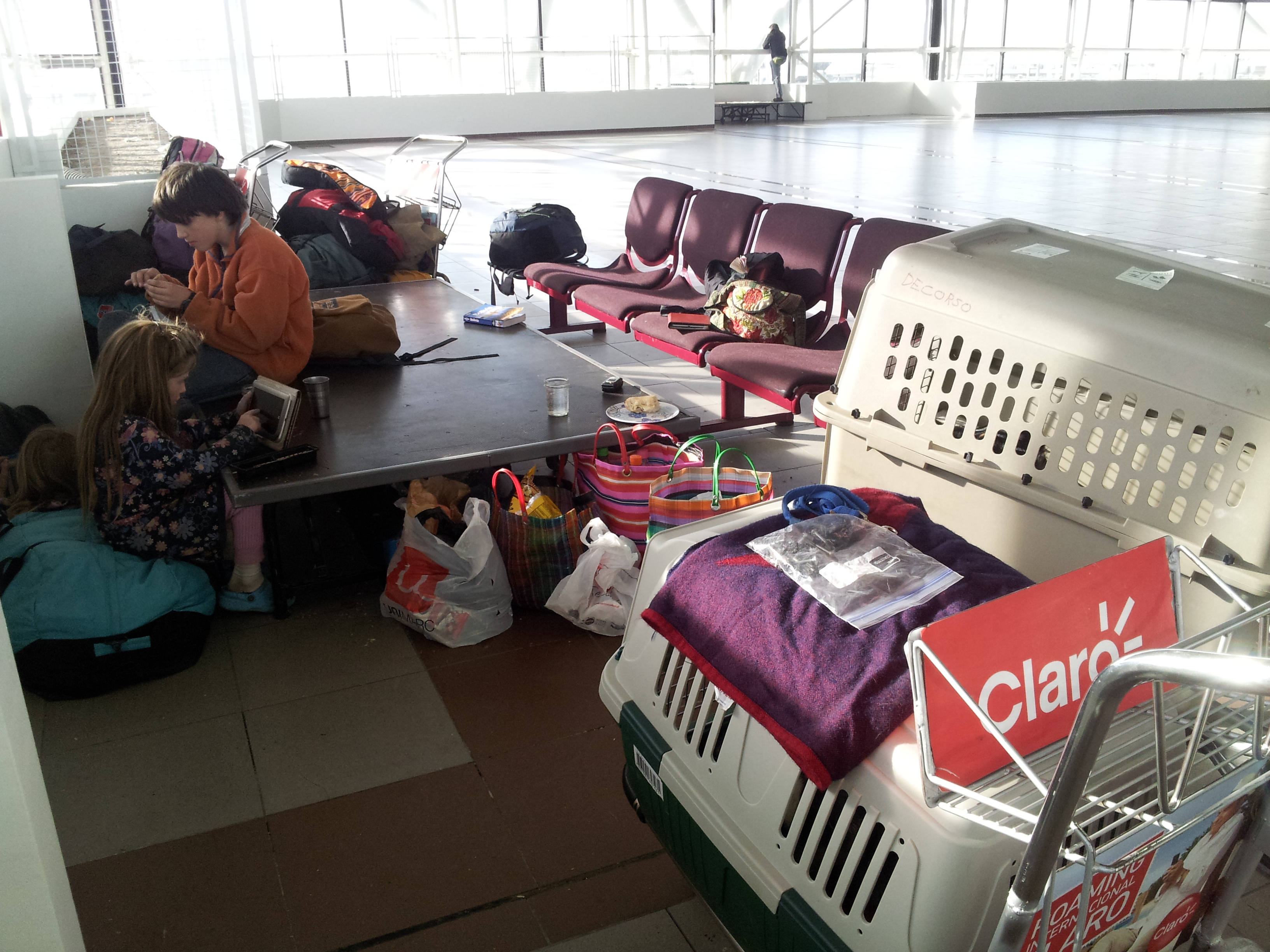 The next morning, we packed up the van with 8 duffle bags, 8 carry on bags, 2 dogs, 2 dog kennels and 8 people and Mark dropped 6 of us & 2 dogs off at the Santiago International Airport. We had done some recon there a few days before and Jack had picked out a place that was tucked away in a loft with a wide open space and no people. We had some kind of flatbed thing as a table and 6 seats. It was perfect. We carted all the stuff, dogs and children to the spot and promptly made a fort of duffel bags and hung out. We played travel Monopoly, Quibbler, Memory, Magic and Boggle. We colored. We played with little cars. We played Mother May I and Red Light/Green Light. We had a picnic lunch. For 17 hours.