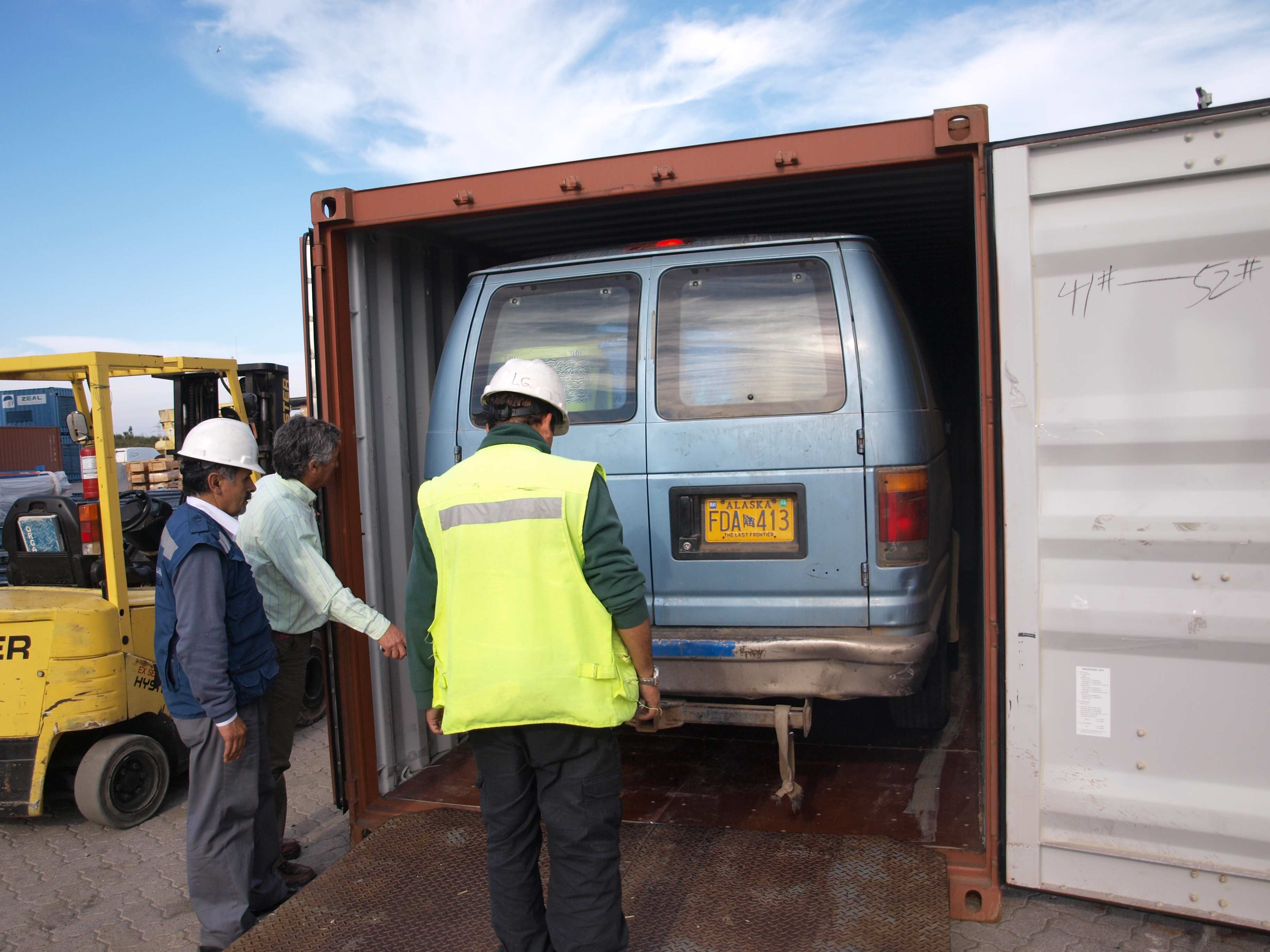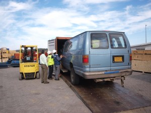 The van was supposed to fit in the container with less than 3” to spare wide and 1” to spare on the top (with the front bumper and light removed). But of course we didn’t really know as we have never driven the van into a container. At the shipyard, the men didn’t think it would fit.