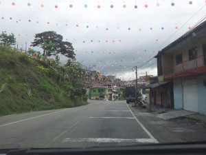 We ascended for 7 hours. More or less straight up and variety of grades, generally around 10% but as steep as 15%. Steeper than we have ever seen in the US. We kept thinking we had reached the top but we still have not reached the top here in Santa Rosa de Osos. Houses are built right on the side of the road, on stilts over the cliff below and landslides have caused piles of rocks in the road making it one lane in some places. And on this road are gigantic vehicles: first class buses, car carrier trucks, cement trucks,
