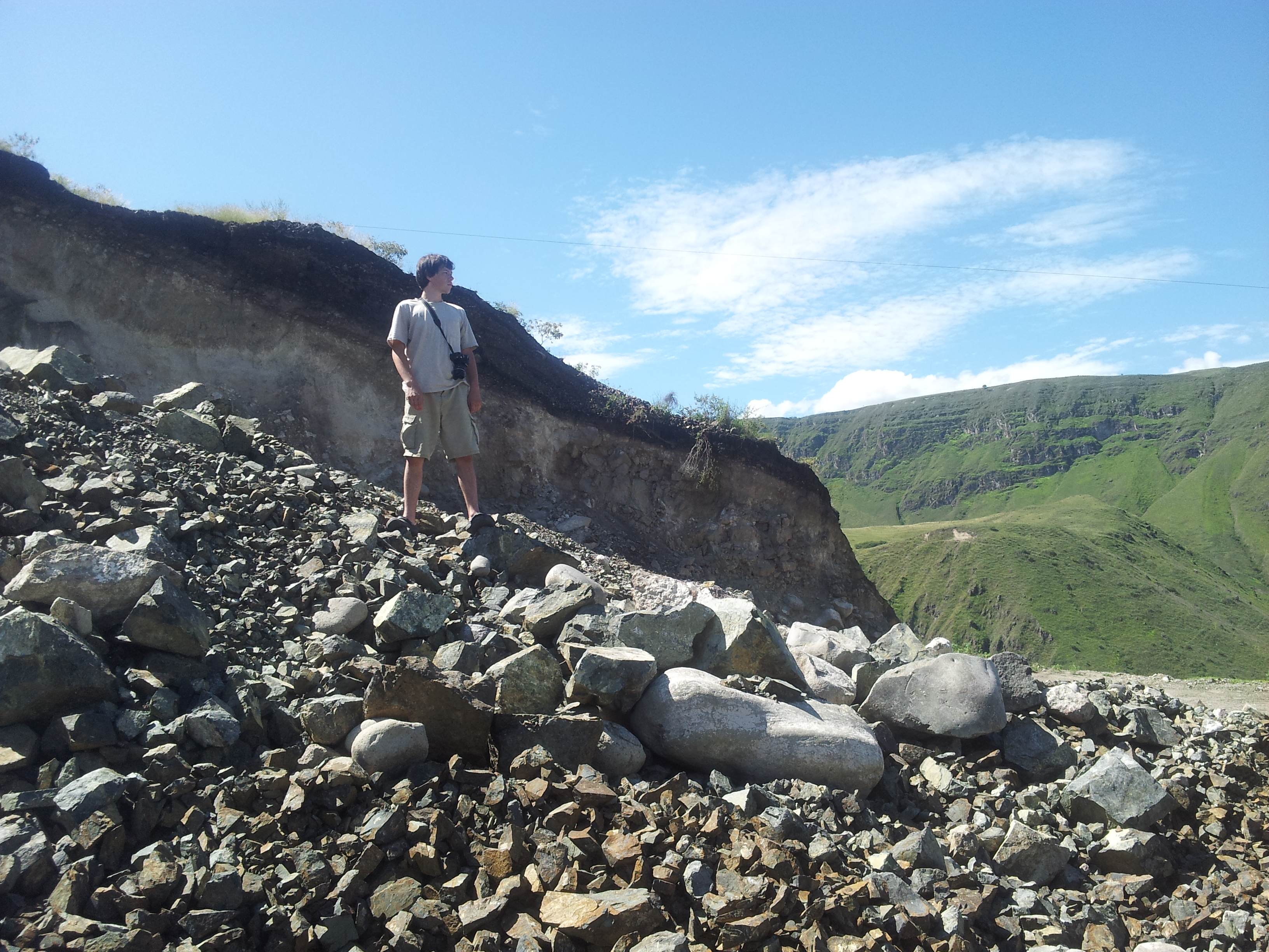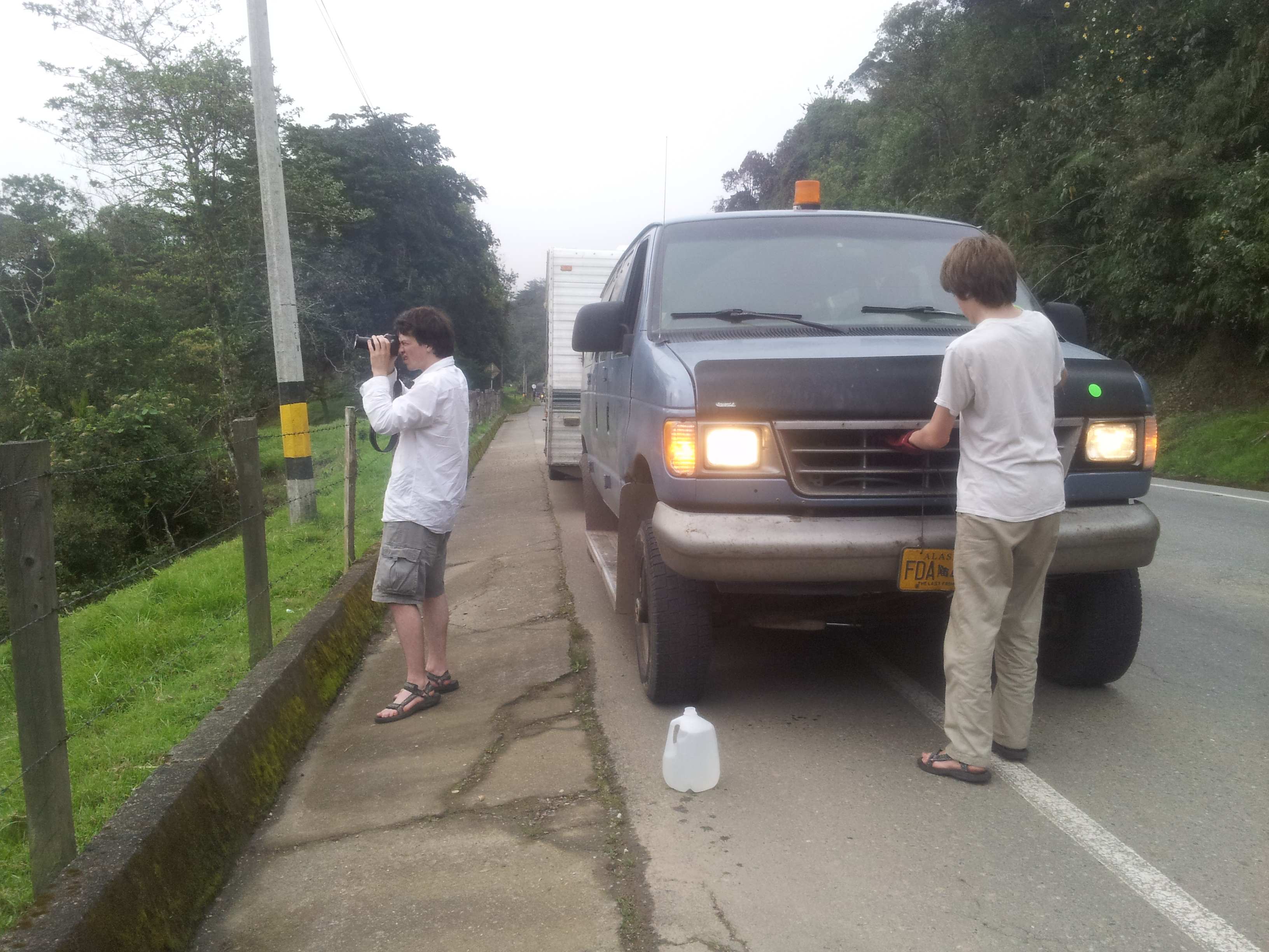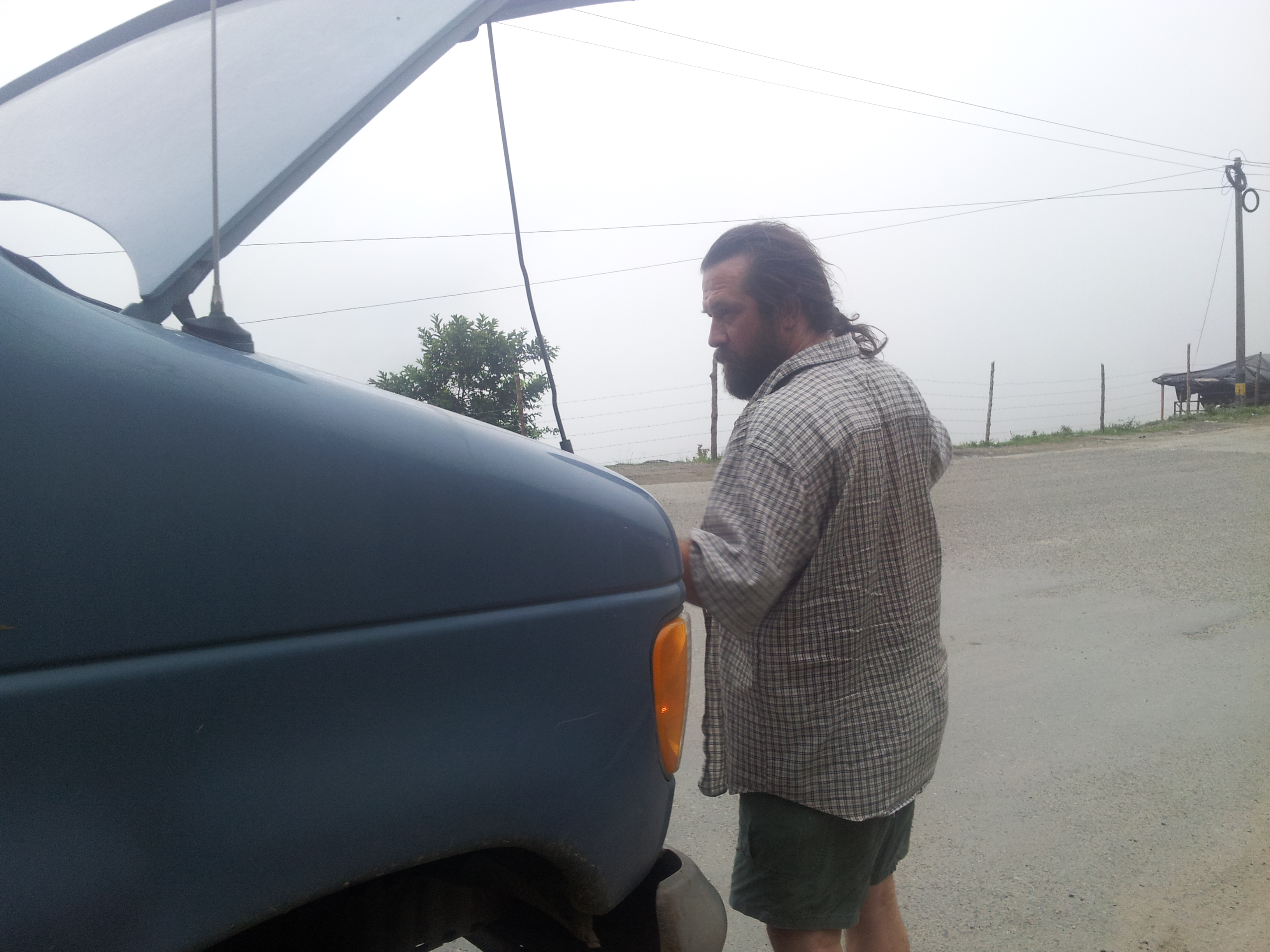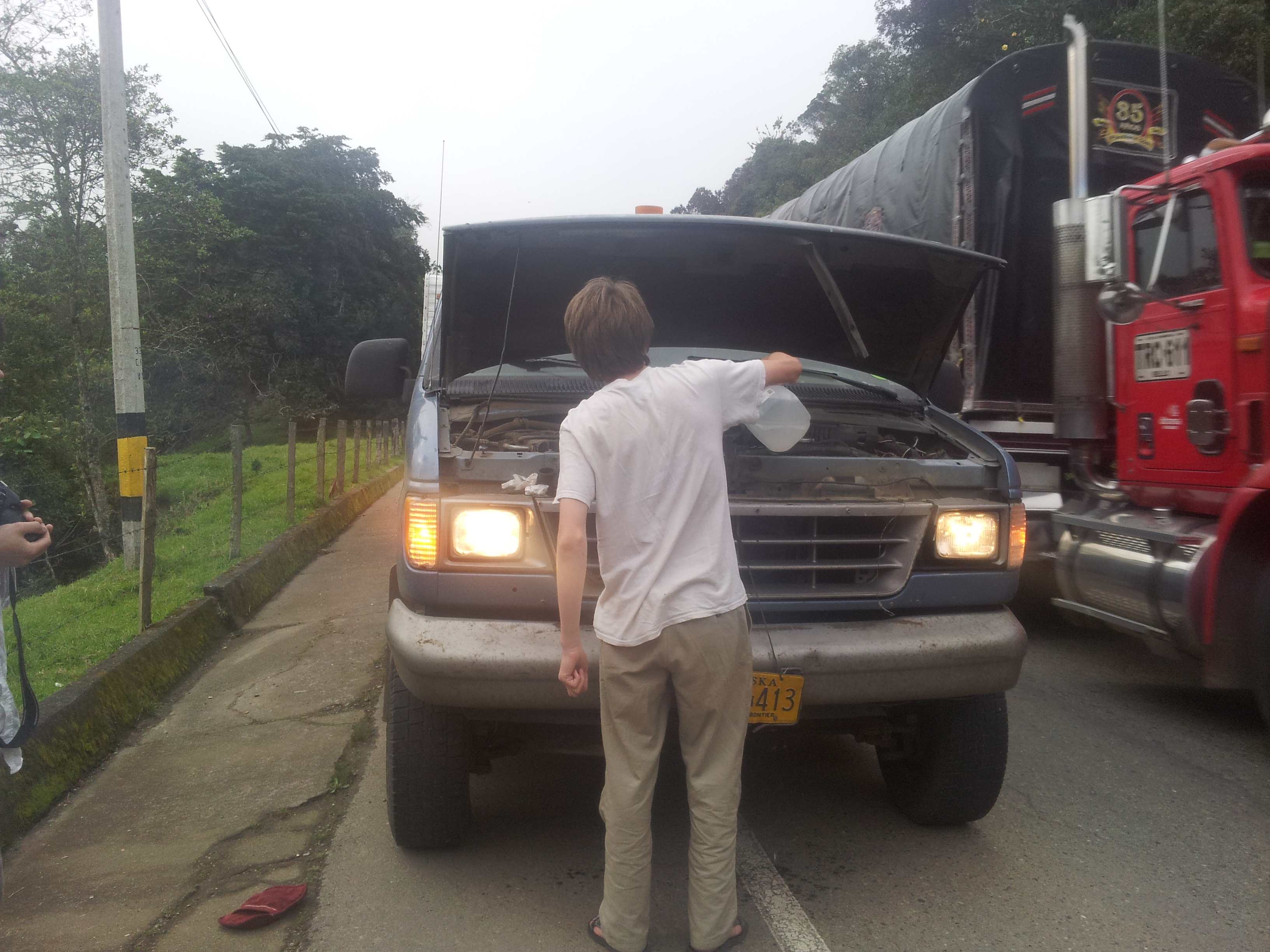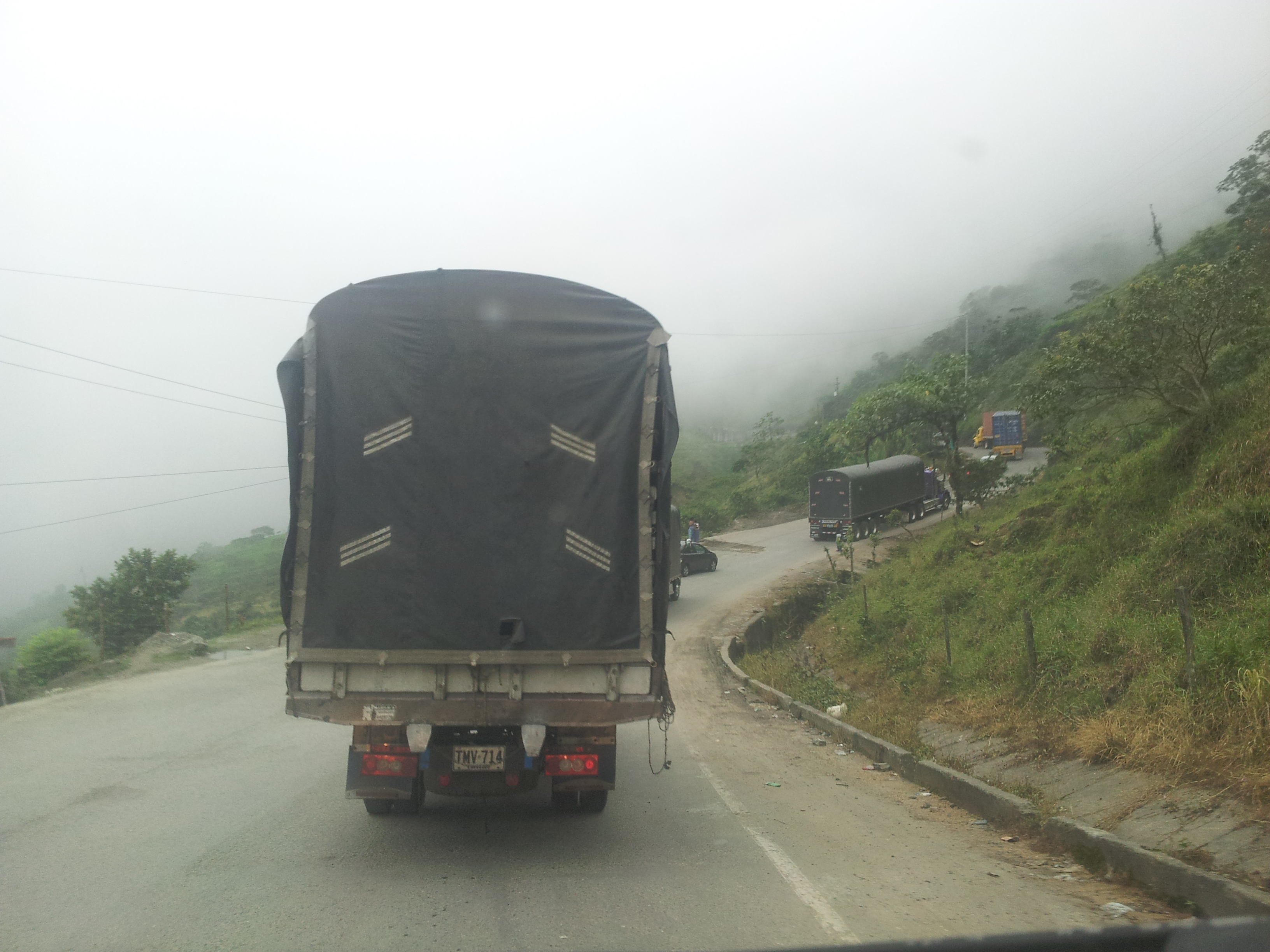 container trucks, trucks filled with cows, a semi truck filled with scrap metal as well as motorcycles and donkeys and children. The van was close to overheating (we had this happen in Death Valley). Jack ran out and poured some water on the radiator. We continued to drive because we could not really stop. There are no shoulders. Or parking lots. Or anything really. The road got steeper and steeper and we entered the clouds and visibility reduced to about 10 feet and we came to a place where the road had washed out and it was one lane and very steep, like a grade of 17% for 200 ft, and buses and trucks going in both directions were queued up to shoot the gap. We are stopped