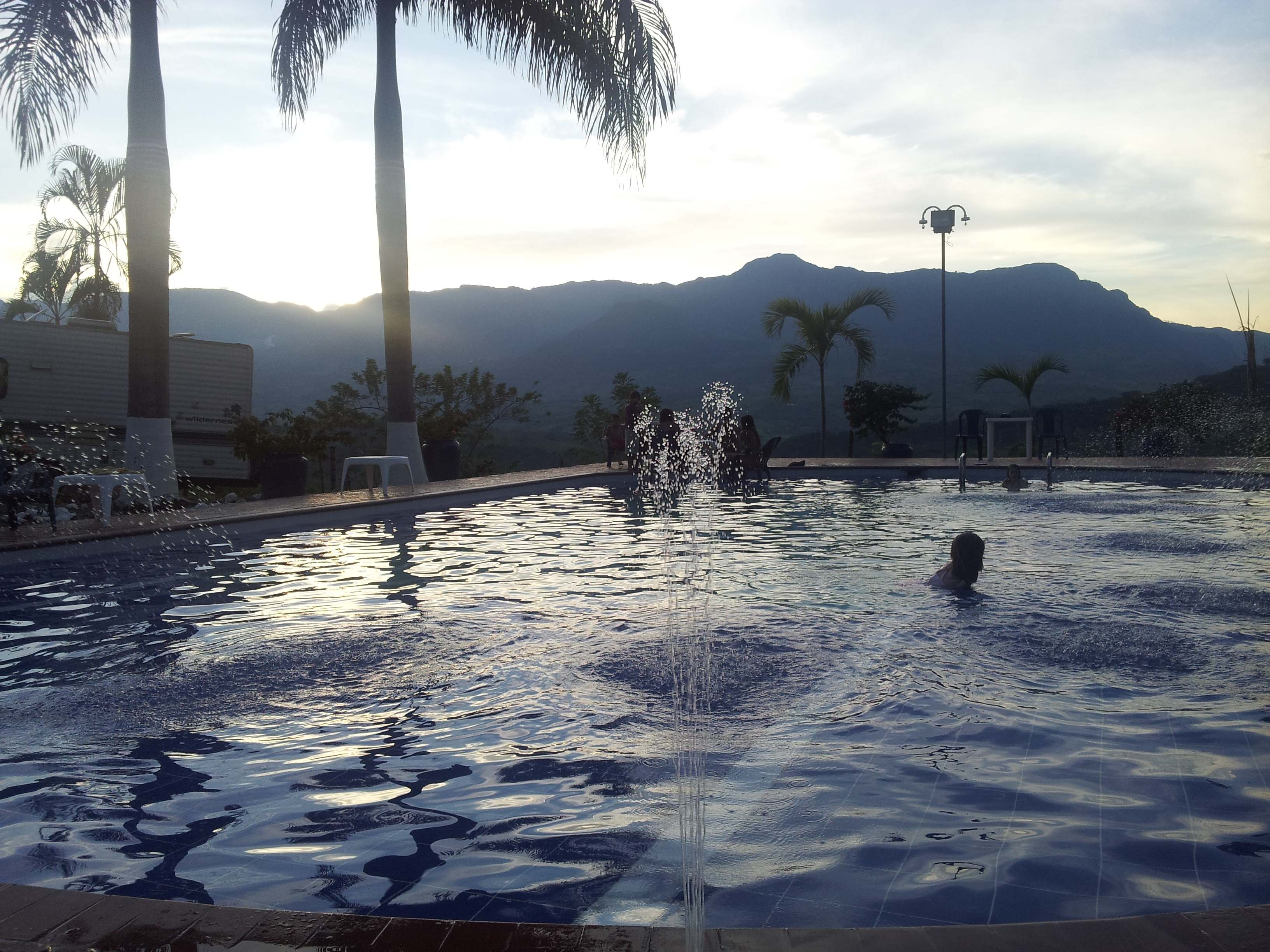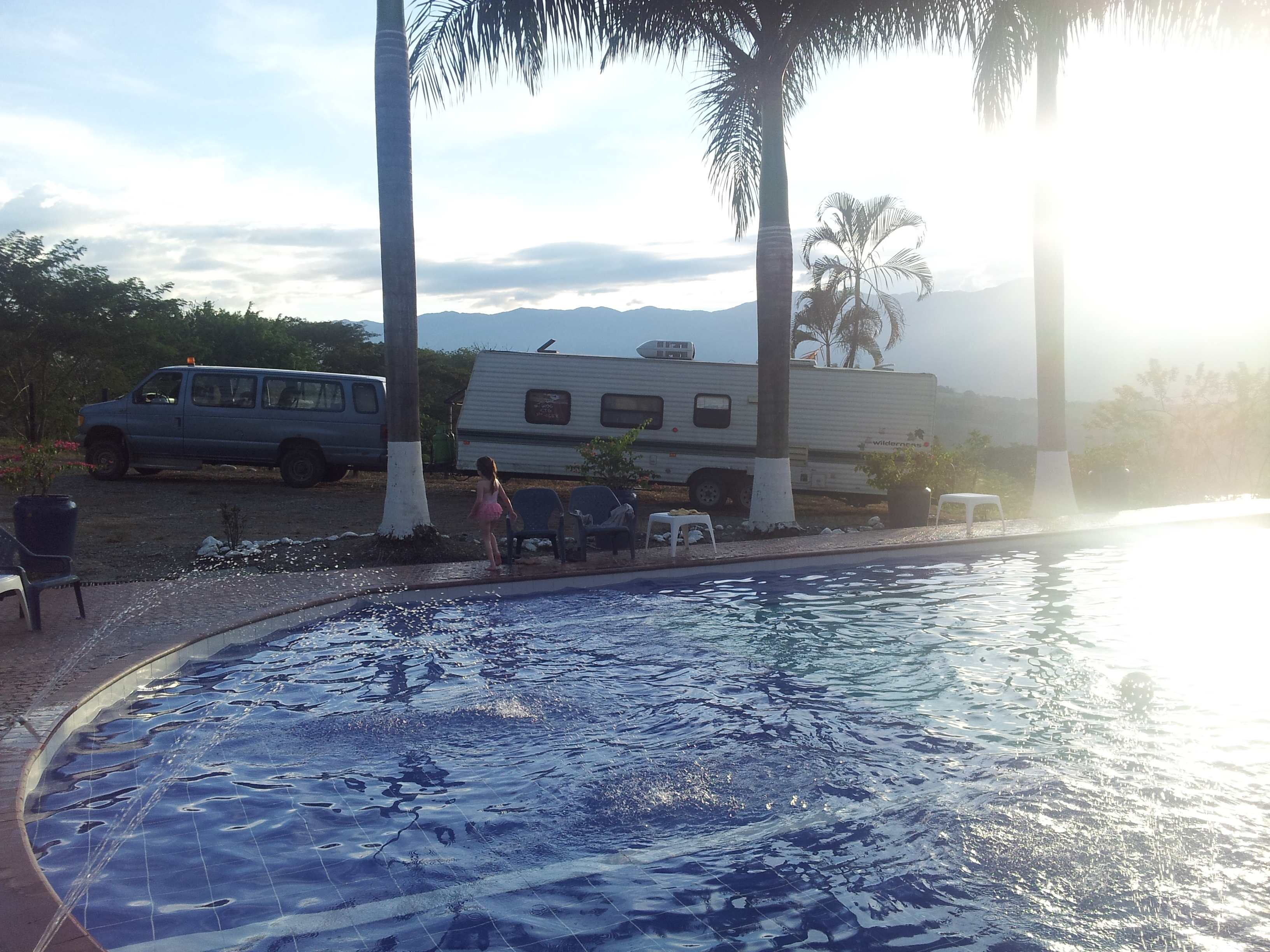 We spent wonderful and relaxing days in the beautiful town of La Pinatada.We saw a parquedearo with a hotel and a pool and it turned out to be one listed in Americas Overland but the name had changed to Mirador del Rocio. We were not really looking for a place to camp but this looked so wonderful that we had to stay. It was $20,000 pesos a night ($11 USD) and that included the pool, the bathrooms and showers and a nice lobby patio with hammocks and ping pong and a pool table. The hotel overlooks the coffee fincas.