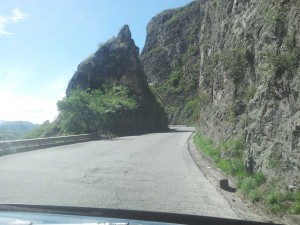 on a steep hill on the side of a cliff with trucks and buses all around us waiting for our turn and when it came – the van would not move. Like it would not drive forward. We had to back down the steep hill to a more or less flat spot (around buses and trucks and children) and then Mark had to figure out what was wrong. It was a tense 10 minutes. What was wrong? We needed more transmission fluid. Mark fixed it and we headed on our way. We had to stop once more to let the van cool down a bit but the road was flat and wider and there was a great view.