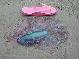 waste garbage) and don’t swim (portugese man’o war -tentacles are dangerous for up to two months following death. Wave action spreads small pieces of tentacles on the sand when the animal was washed up. Stepping on them or touching causes excruciating pain. Wounds can take weeks to heal. From the beach warning signs).